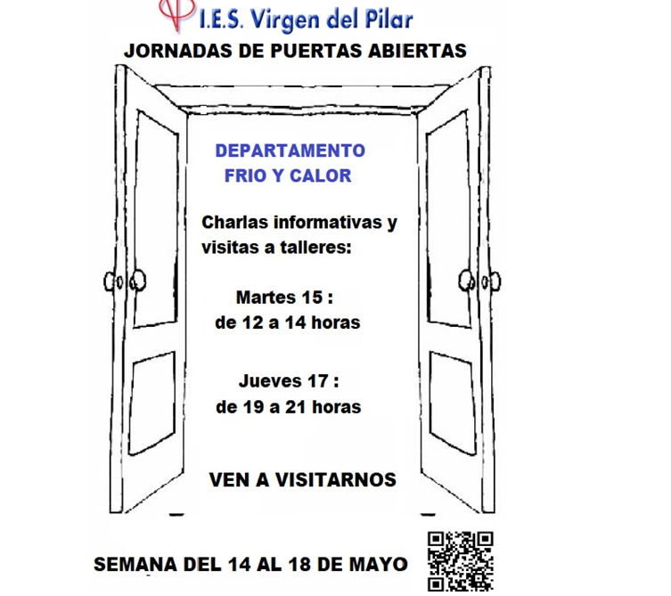 La semana del 14 al 17 de Mayo se celebrará la semana de la formación profesional. Durante esta semana recibiremos a quien a conocernos e informarse sobre los ciclos formativos del Departamento de Frío y Calor.